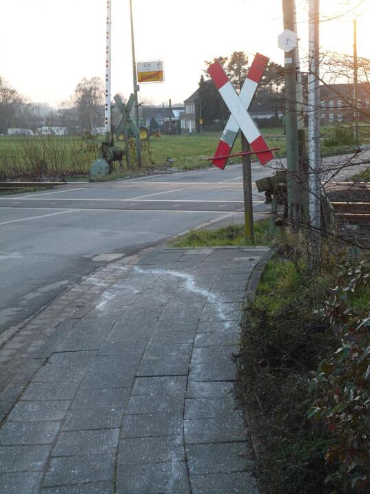 Auf beiden Seiten der Bruchstraße Richtung Eyll endet der sehr schmale Fußweg vor dem Sockelfundament der Bahnschranke.